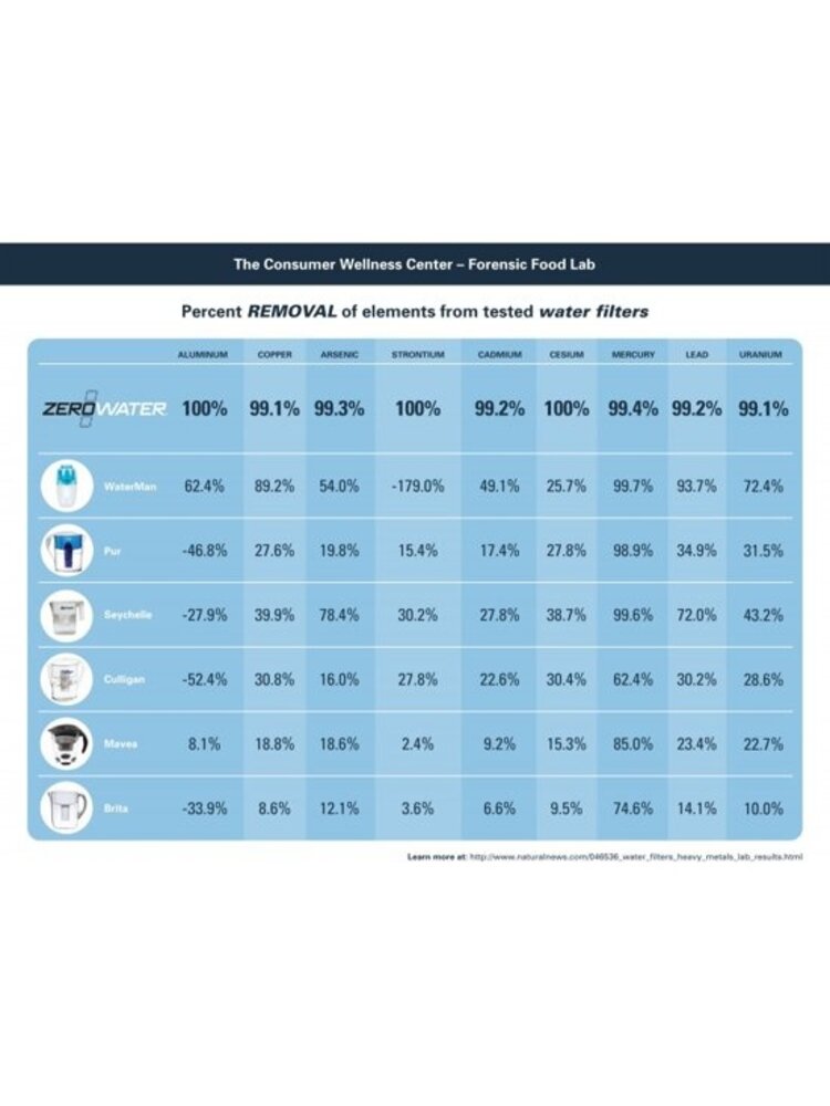 ZeroWater is not an ordinary water filter! ZeroWater delivers a unique 5-stage ion exchange technology compared to conventional 2-Stage filtration. Enjoy the purest tasting water with a filter that removes 99.6% of TDS (Total Dissolved Solids) from your tap water, such as Aluminium, Zinc, Nitrate, Fluoride and more! It is the only water filter that meets FDA standards for TDS in purified bottled water. This provides you with a pour-through, gravity fed filter certified by the NSF to reduce Lead and other heavy metals; such as Chromium 3 and 6.